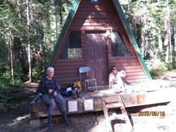 There are a few creek crossings that were not an issue and the bug situation was reasonable. From the low point on the trail, you make the final climb to Elsay Creek and onto the lake. Once at the lake (elevation 2526') which is situated at the base of Mt. Elsay, we set up camp by the Rangers Hut. While the hut is not somewhere you would want to sleep, it did provide us with protection from the evening bugs while we played a record breaking five rounds of "Bones". Winner was Alexis! The lake is quite nice, but the shoreline could be quite muddy if we did not have the current dry spell. It even had lily pads to aid in dish washing as Alexis discovered.
